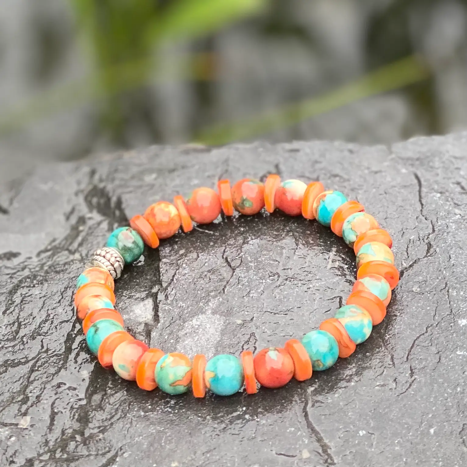 Kralen armband , Orange 8mm, met spacer schelpdisc orange rond 3mm