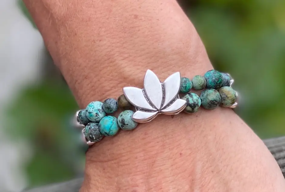 • Hand wearing turquoise beaded bracelet JaXX armbandset Cross Softtones groen groen 8 en 10mm en Sterling zilveren eindbead €44,95 - €159,00Prijsklasse: €44,95 tot €159,00