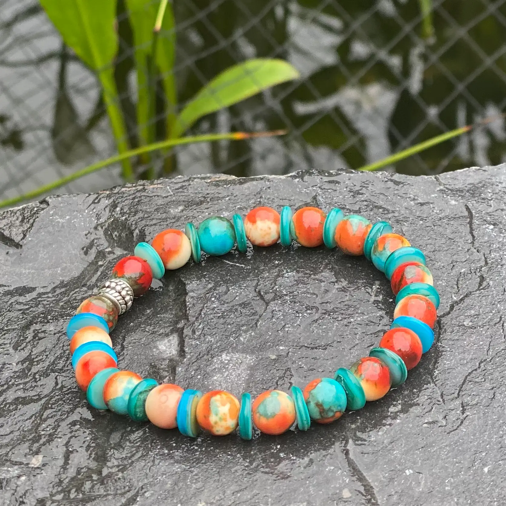Kralen armband , Orange 8mm, met spacer schelpdisc turquoise rond 3mm