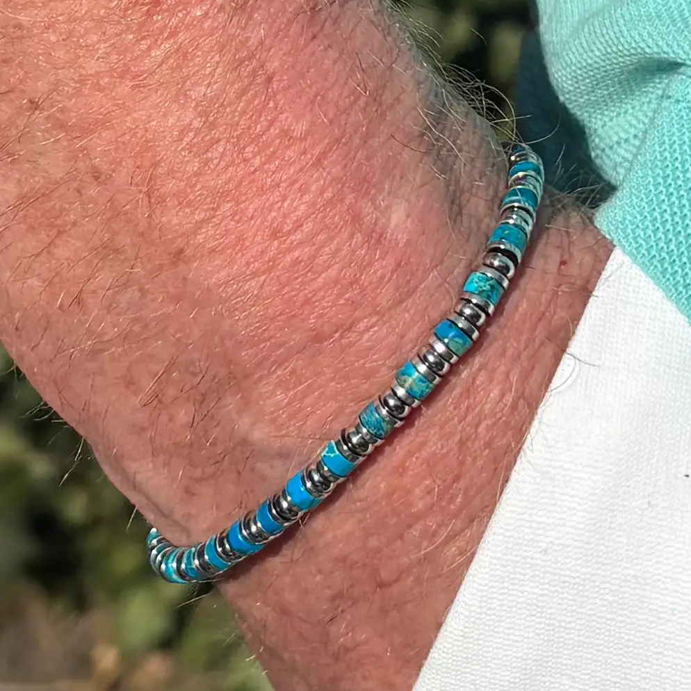 • Hand wearing turquoise beaded bracelet JaXX armbandset Cross Softtones groen groen 8 en 10mm en Sterling zilveren eindbead €44,95 - €159,00Prijsklasse: €44,95 tot €159,00