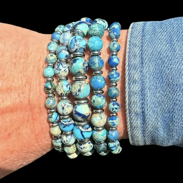 • JaXX armband 6,8 en 10 mm AAA Imperial Jasper  zeeblauw met Sterling zilveren eindbead JaXX armband 6,8 en 10 mm AAA Imperial Jasper zeeblauw met Sterling zilveren eindbead €59,00 - €249,00Prijsklasse: €59,00 tot €249,00