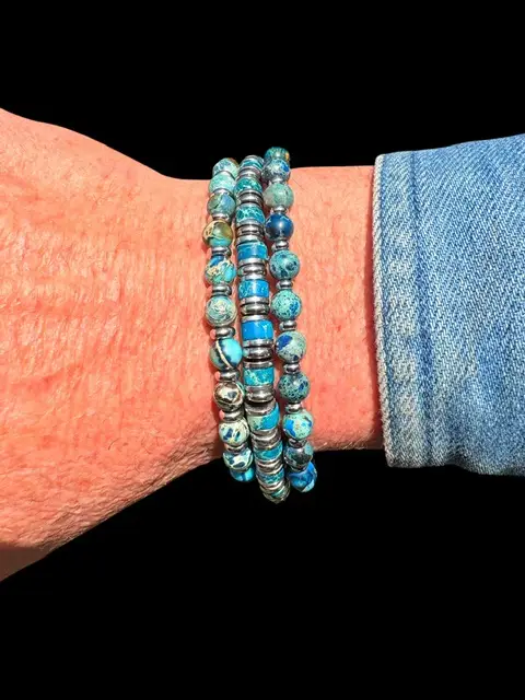 • Hand wearing turquoise beaded bracelet JaXX armbandset Cross Softtones groen groen 8 en 10mm en Sterling zilveren eindbead €44,95 - €159,00Prijsklasse: €44,95 tot €159,00
